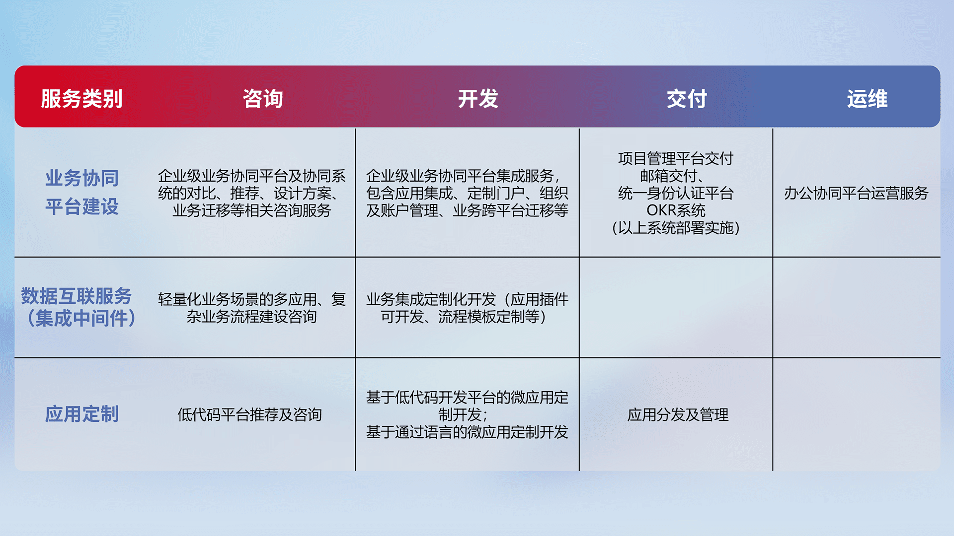 针对钉钉、、企微、、IDaas等平台级产品提供产品的规划、、、方案、、、交付、、、定制化开发等服务,,实现如统一协同办公、、、、智能客户服务、、、混合会议管理、、智能数据查询、、等业务场景,,,,实现数字化转型。。。